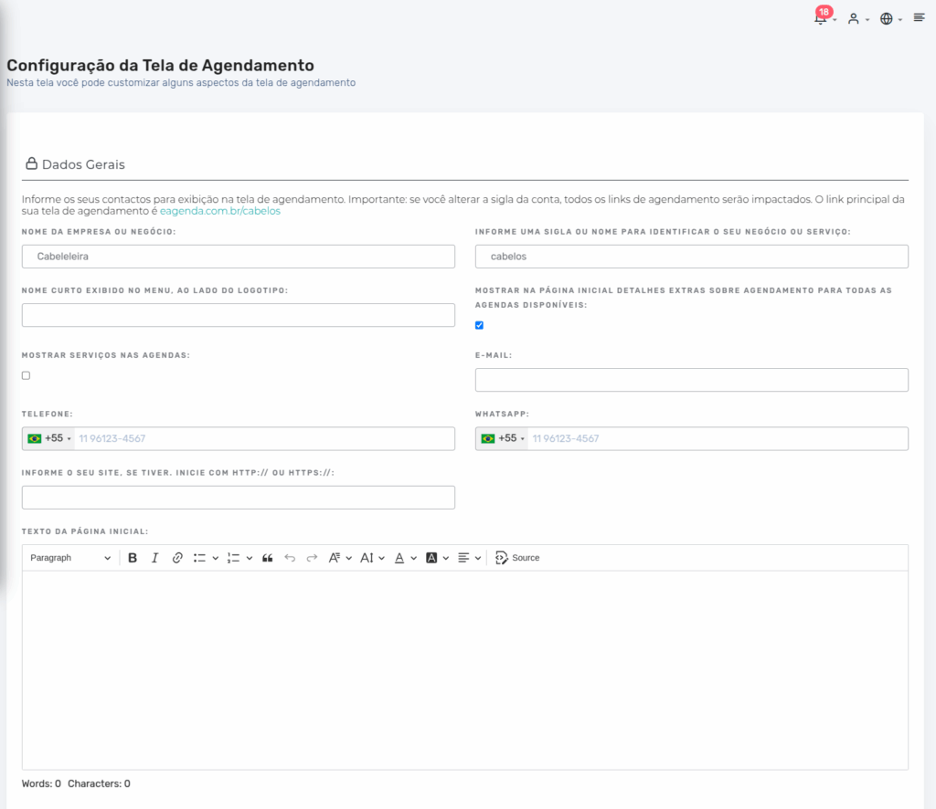 Nesta aba você pode preencher informações sobre seu negócio que ficarão visíveis na tela de agendamento, incluindo nome do negócio, informações de contato e um texto descritivo.